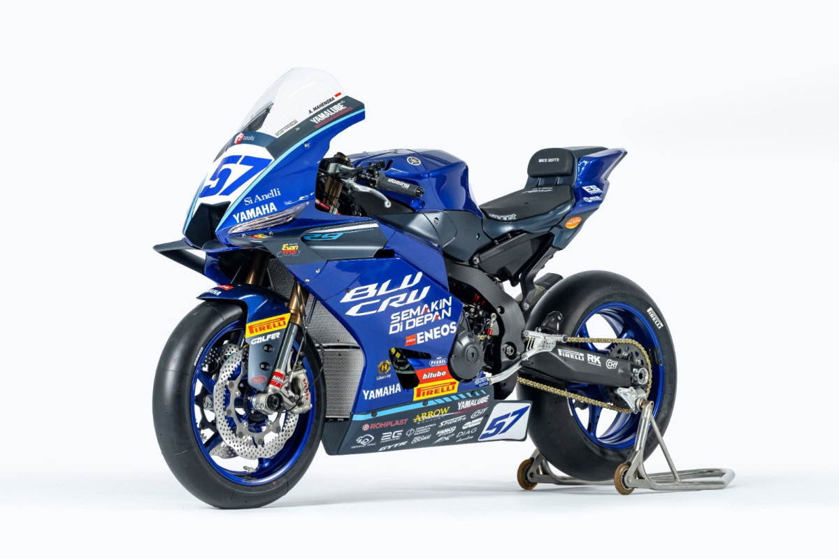 bLU cRU Pro Racer Aldi Satya Mahendra dan rekan setimnya yaitu Can Oncu tampil perdana berseragam official menggunakan wearpack dominan berwarna biru dengan sentuhan kuning. Selubung livery R9 buat balapan di World Supersport 2025 juga akhirnya tersingkap, menampilkan tampilan atraktif dengan identitas kuat Yamaha.
